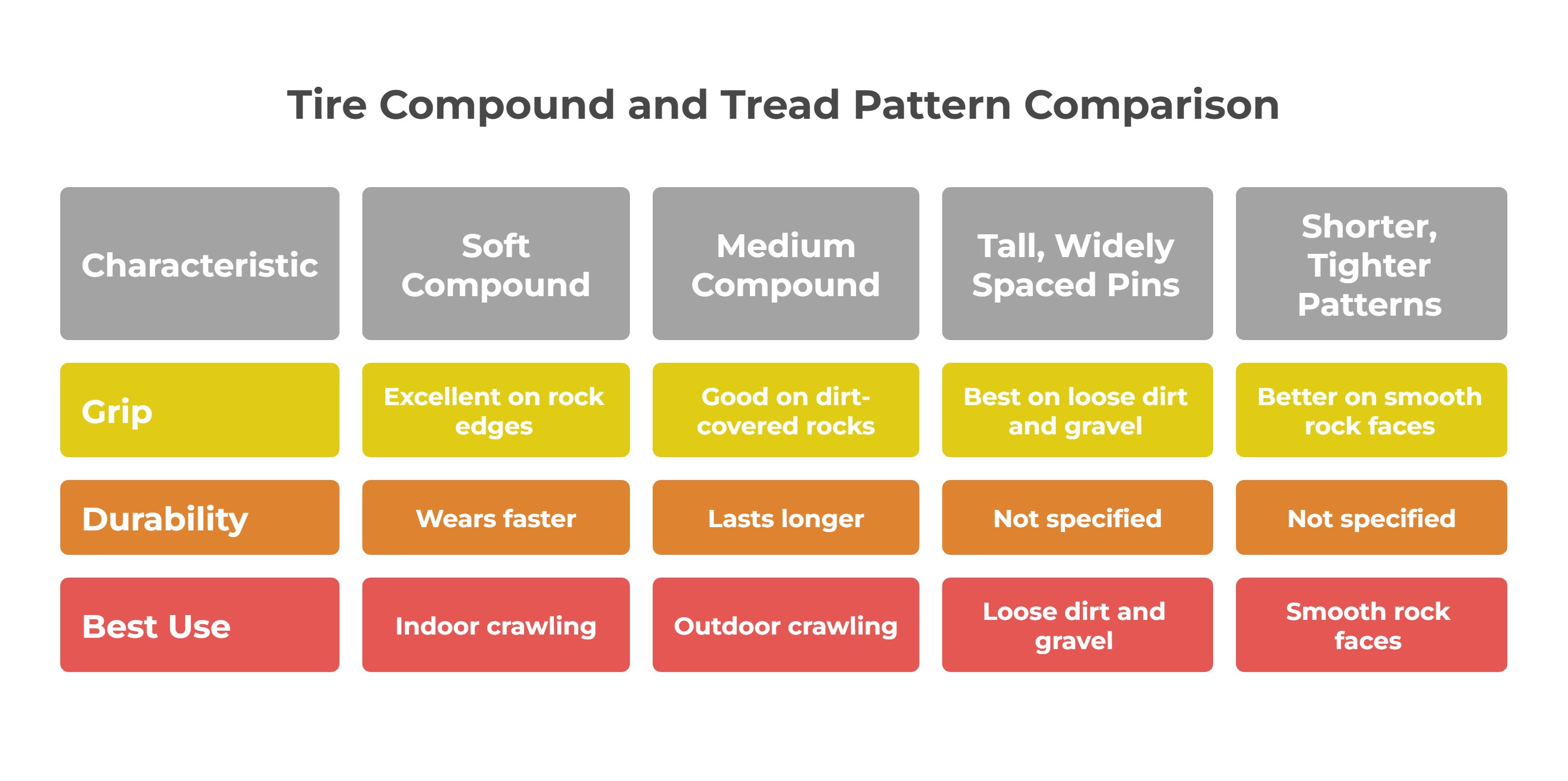 But for indoor crawling, soft tires excel since surfaces stay clean. Outdoors, medium compounds last longer and handle dirt-covered rocks reasonably well.