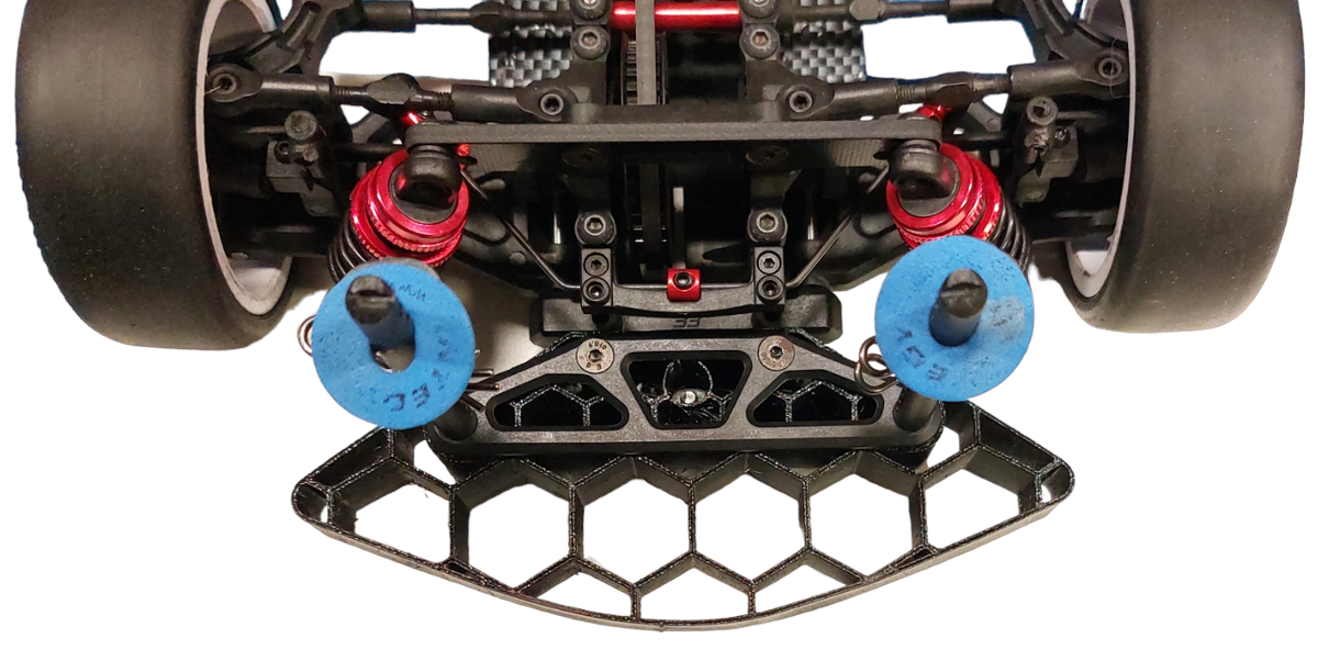 MG-series bumper's design is made so that the bumper sits firmly over the the bumper plate. This design allows a part of the force of possible impact to be guided to the bumper plate and this removes the unwanted stress from the body posts and front bulkheads. With 3D printing we can manufacture bumpers with more complicated forms compared to a normal foam bumper. With more open bumper design we have achieved better air flow inside the body and not forgetting more forgiving behavior in collisions.